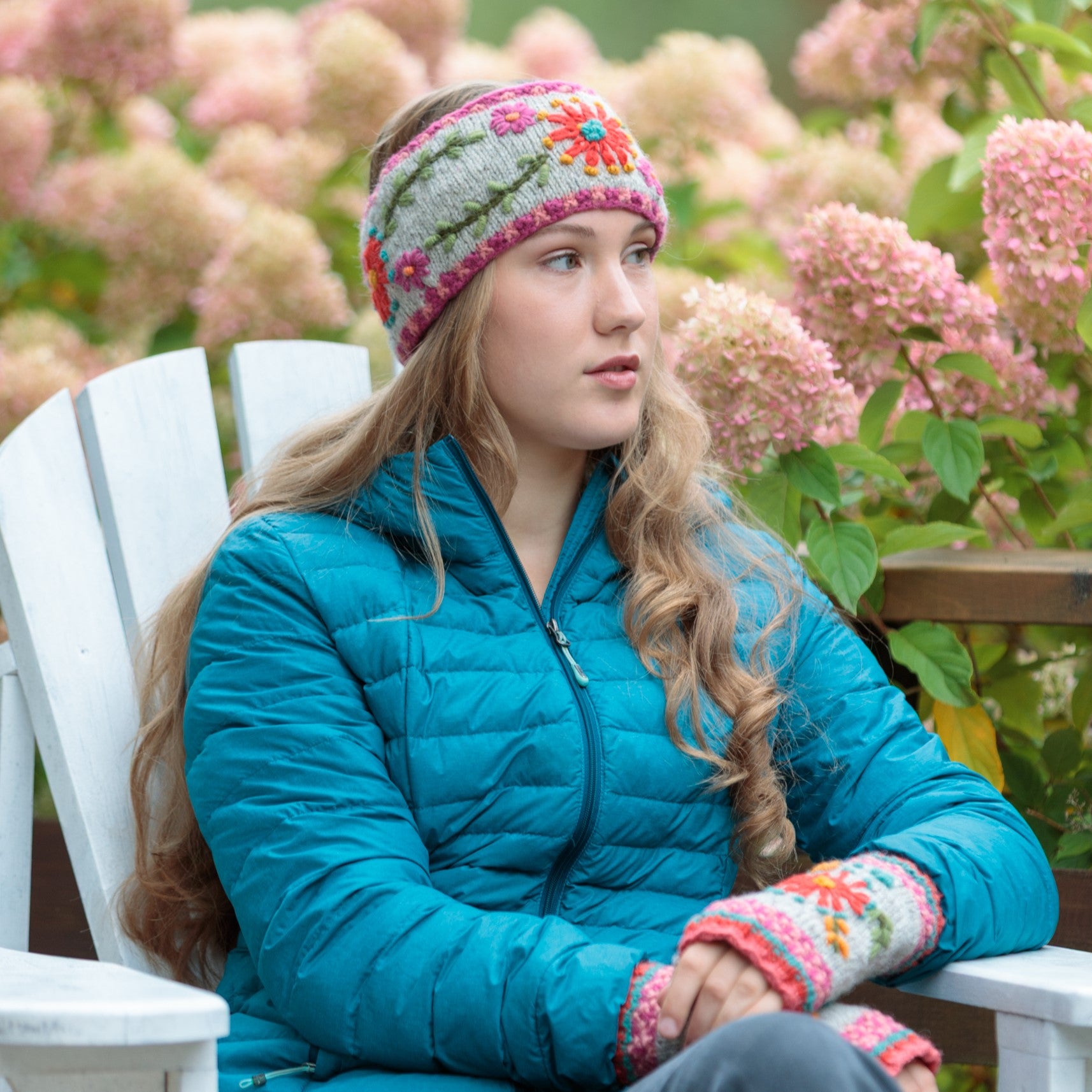 Undeniably feminine, the Abigail Headband features a bold floral medallion and vine patterns inspired by Eastern European folk embroidery. Over-stitch detailing lend this design a handmade-with-love feel. Extra wide and fully fleece lined for warmth. Also available as a beanie, boot cuffs and hand warmers.