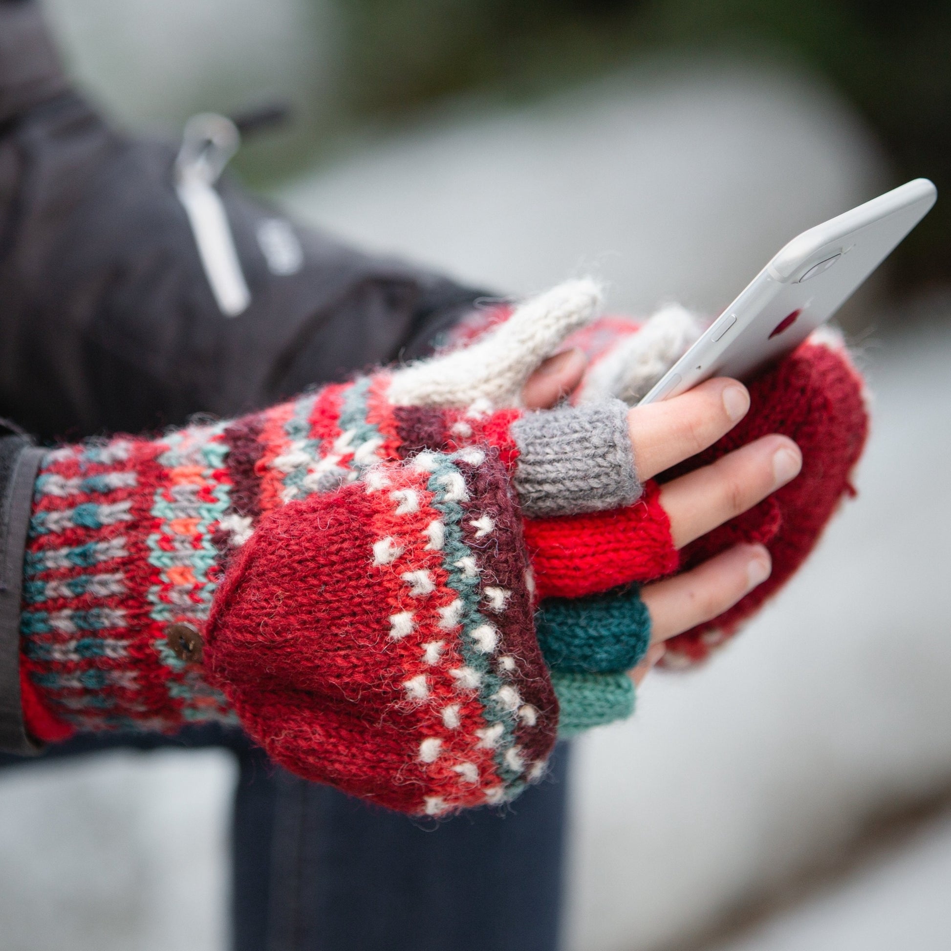 Stay warm and stylish with the Jasper Finger Mittens, fully fleece-lined for ultimate comfort. Featuring a button-down loop for practicality, these mittens showcase the same Nordic snowflake and blizzard pattern as the matching beanie. The half-fingers, crafted in five complementary shades of wool, add a playful touch to this functional and fashionable winter accessory.
