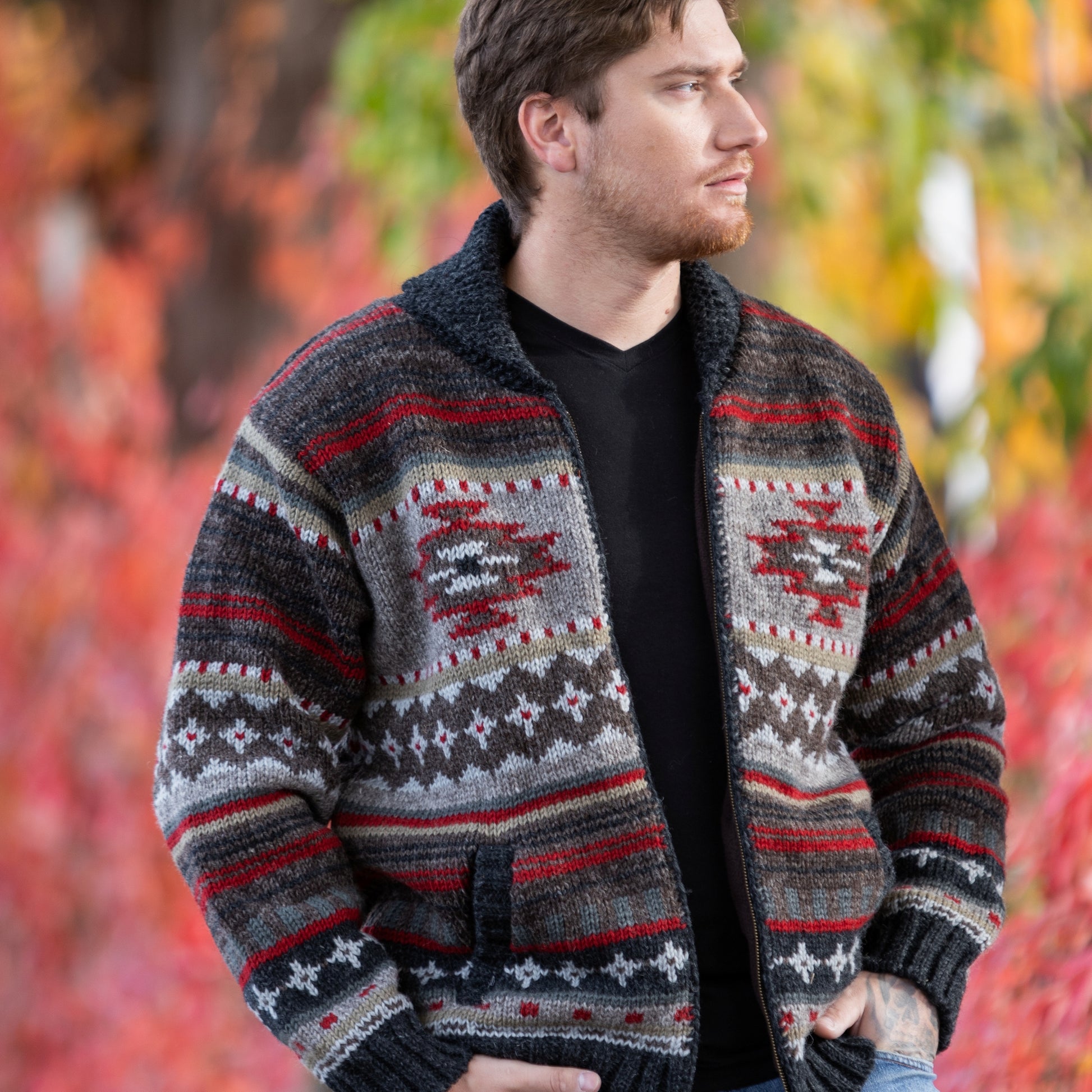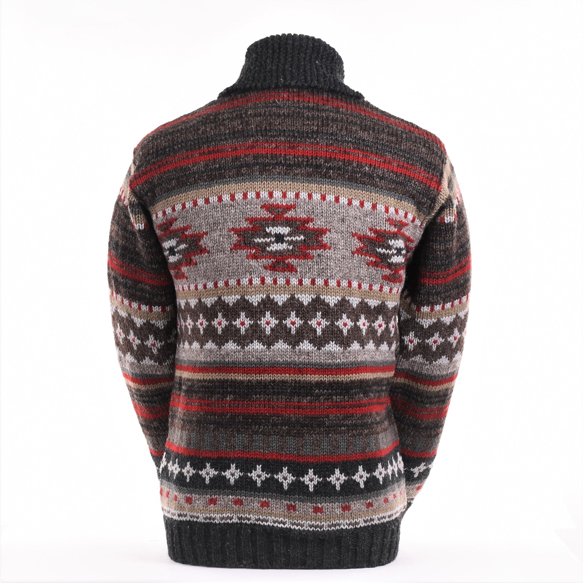 The Mateo Sweater captures rugged Western charm with a medley of Southwestern-inspired symbols in rich wool tones. Its intricate layers of color and subtle patterns evoke the spirit of open landscapes and desert sunsets. Finished with a handsome shawl collar, ribbed waist and cuffs, and a fleece-lined interior, this sweater offers warmth, comfort, and timeless style. Perfect for those who appreciate Western-inspired fashion with a touch of sophistication.