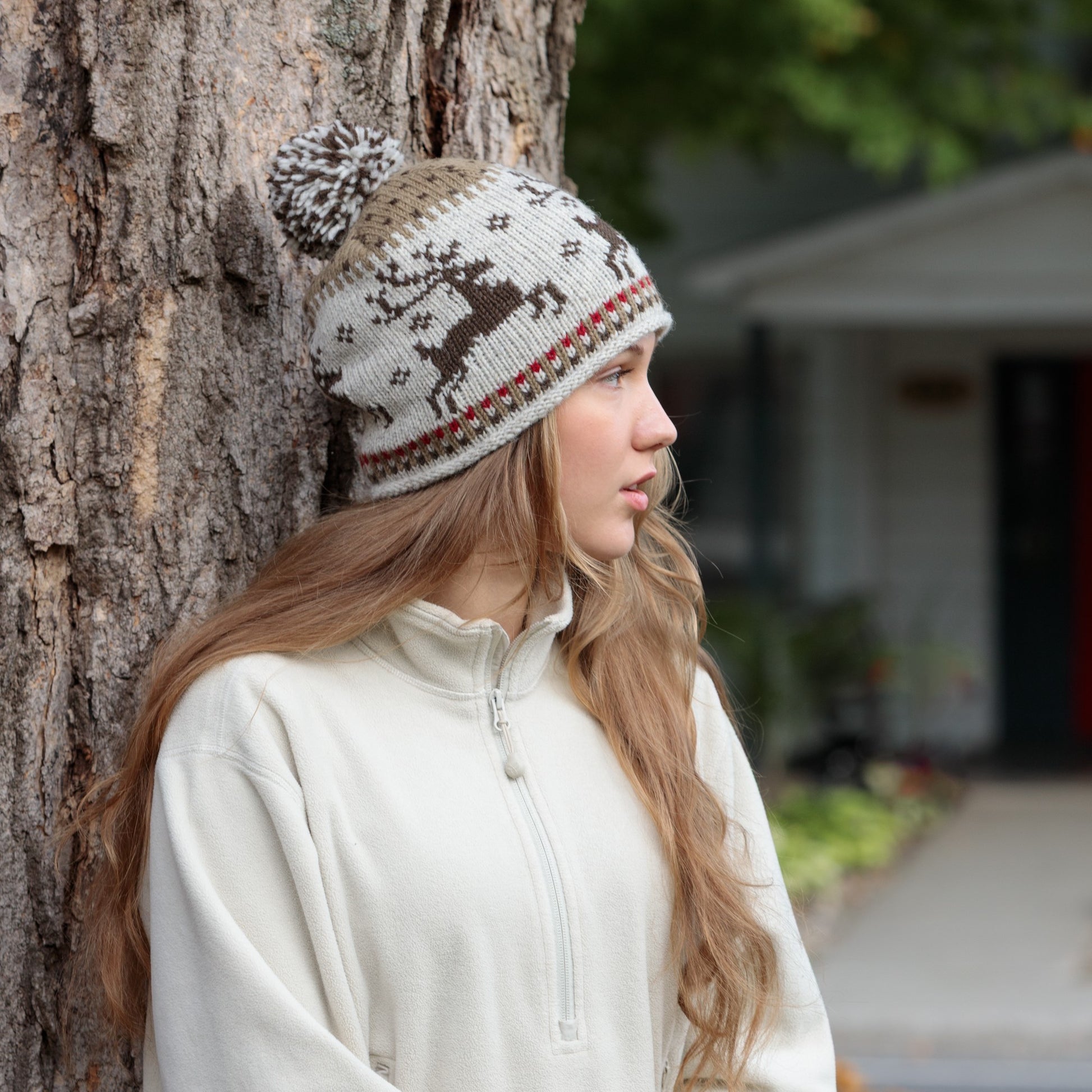 Bring on the holiday cheer with the Yuletide beanie hat, a festive essential for winter days. Hand-knit from 100% wool and fully fleece lined for cozy comfort, it features classic Nordic-inspired motifs, a playful pom-pom, and earflaps with braided tassels. Whether you're dashing through the snow or sipping cocoa by the fire, this hat brings warmth and whimsy to every occasion.